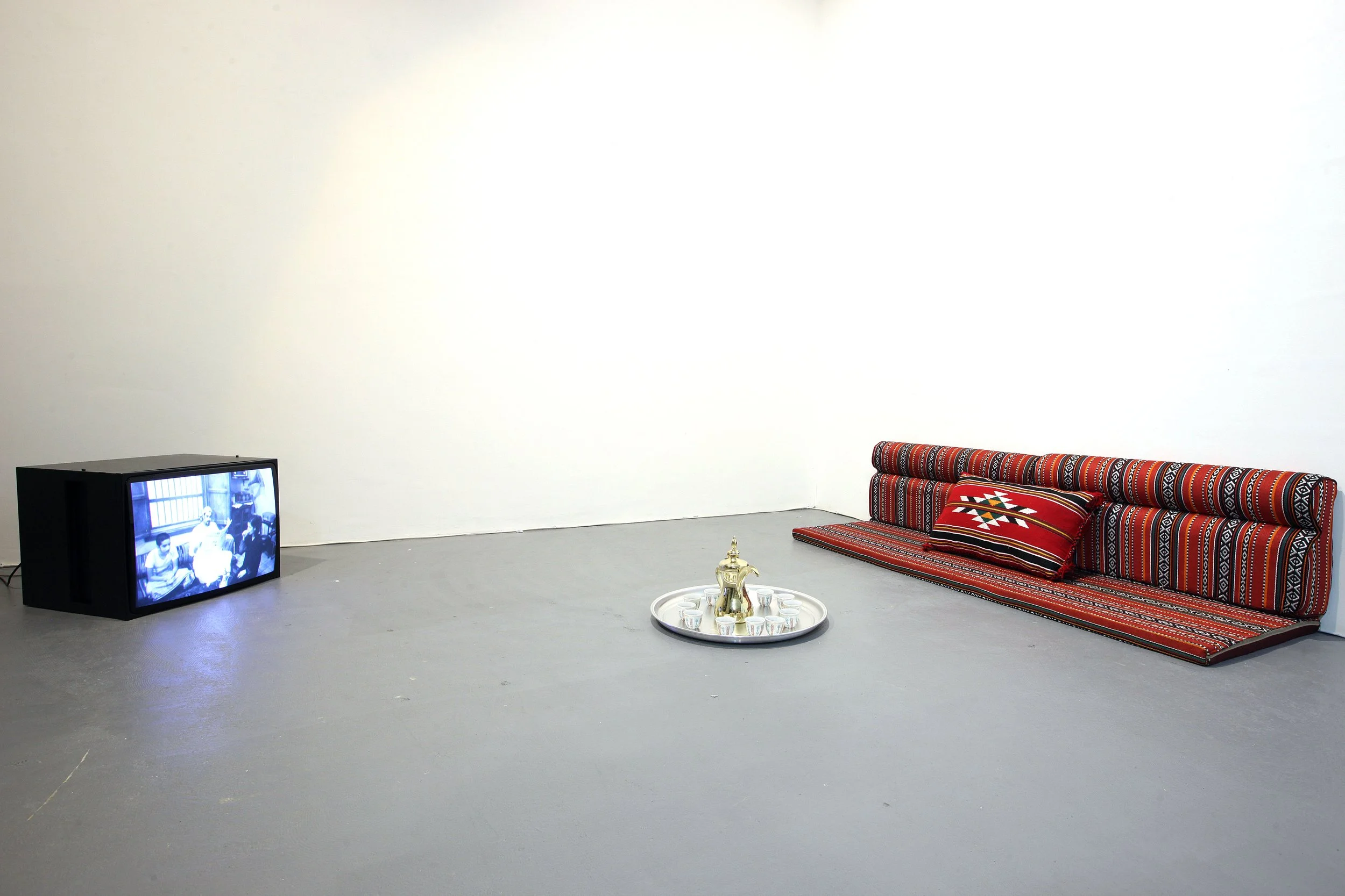 The video is filmed in a room that has been recreated to look like it is situated in a traditional Kuwaiti mud house. Its purpose is to transport you back in time, a reinvented space that aims to mimic the architecture of our past. This artificial space acts as the environment for the simulated narrative of this Kuwaiti household. The story is superficial and uses tradition as a basis for cultural recollection. It also uses the traditional elements as a way of identifying with the past since they are still prominent today. This nostalgic view is problematic as it is reflecting what already subsists rather than different histories of ourselves that no longer exists.