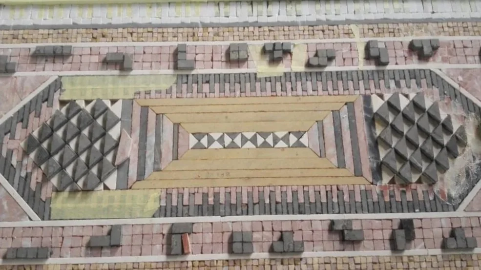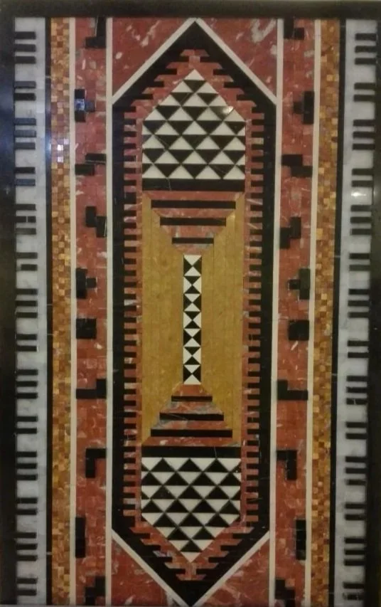 The central space of the piece represents the present on the surface but also acts as a gateway to the artists past. Staples from the artist’s childhood such as piano keys stemming from his background in music, and video game Tetris-inspired blocks are integrated into the outer spaces of the piece. Different types and colors of marble are used much like the threads woven together in sadu, interlocking and intermingling slices to create a whole. Additionally, the choice of marble was no coincidence either as the artist grew up around his family’s own affinity for marble that motivated them to found a decades old business around the craft.